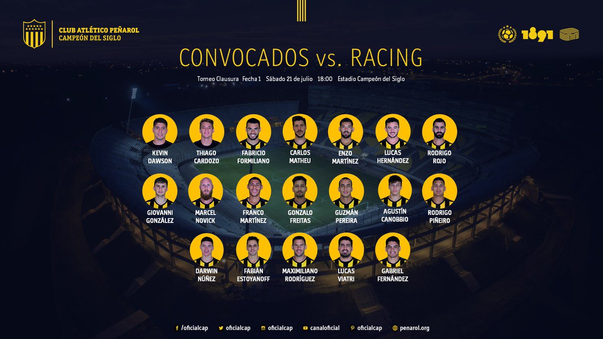 #Peñarol vs #Racing | Dawson ; Gio González, Matheu, Formiliano, Hernandez; Pereira, Freitas, Estoyanoff, Canobbio, Darwin Nuñez y "Toro" Fernandez.
