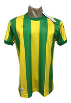 Con un amarillo bien fuerte , medias negras, espalda rayada con numeros blancos.